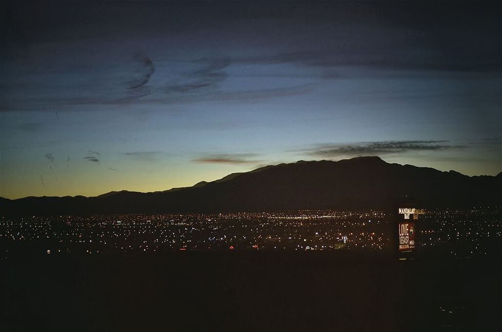 The mountains to the west of Vegas have reddish stripes of rock in them, which of course can't be seen in this photograph. In fact, except for the Mandalay Bay sign I don't think you could really tell this is Vegas. I don't quite remember where I took this, but given what I see in the picture it was taken from inside the Mandalay Bay. This makes sense, as the windows there are gold tinted.